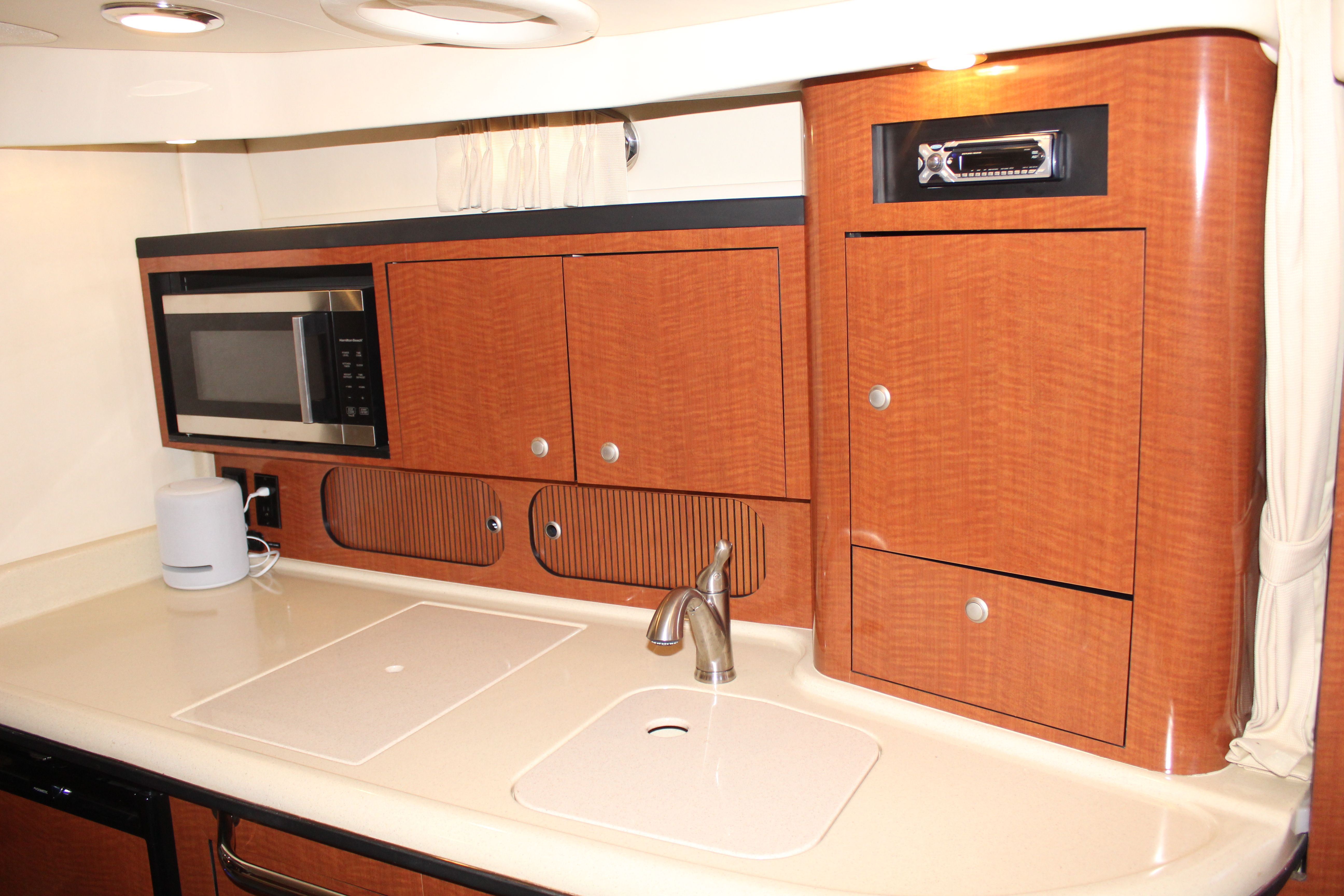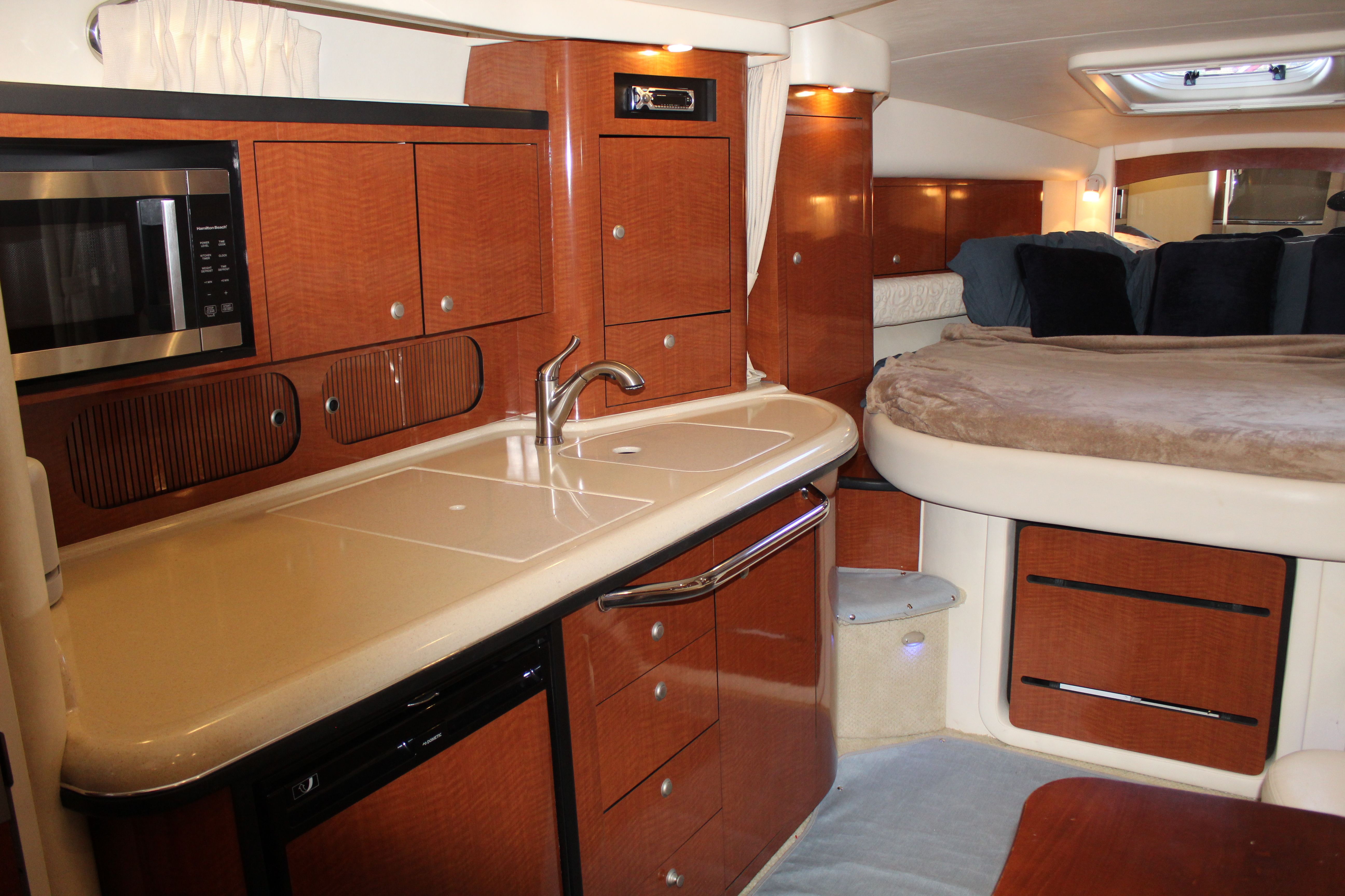 - **Galley:** Equipped with a microwave, stove, refrigerator, and sink